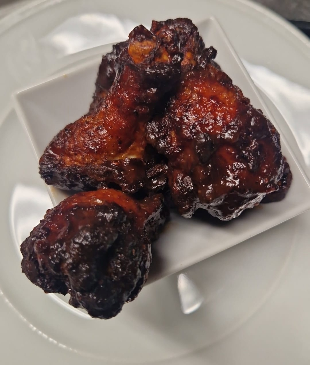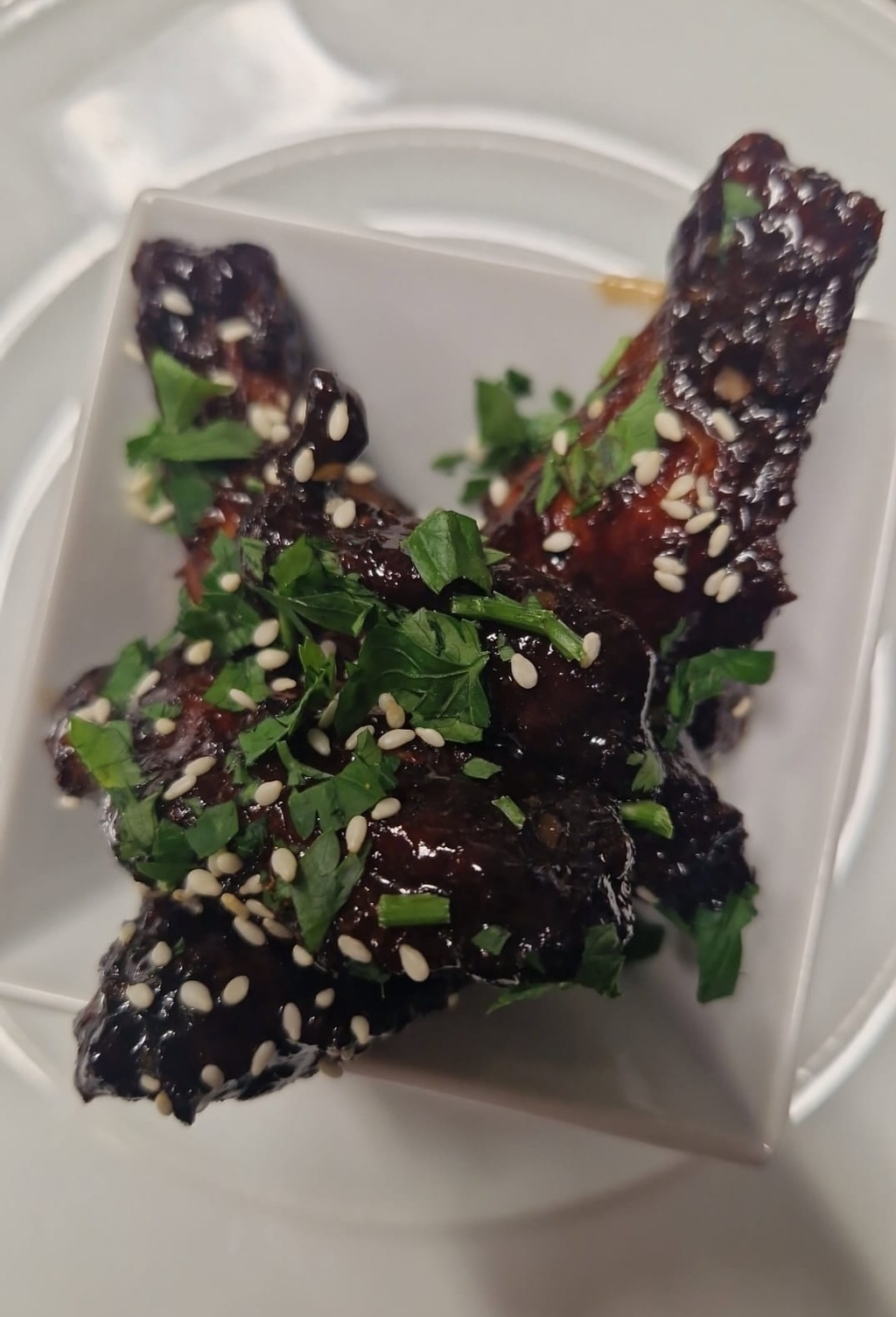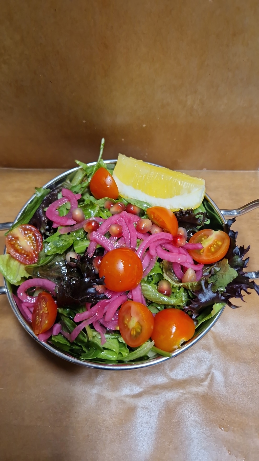 Mix salad, cherry tomato, pickled red onion, chicken, portabello, avocado and mango curry sauce
